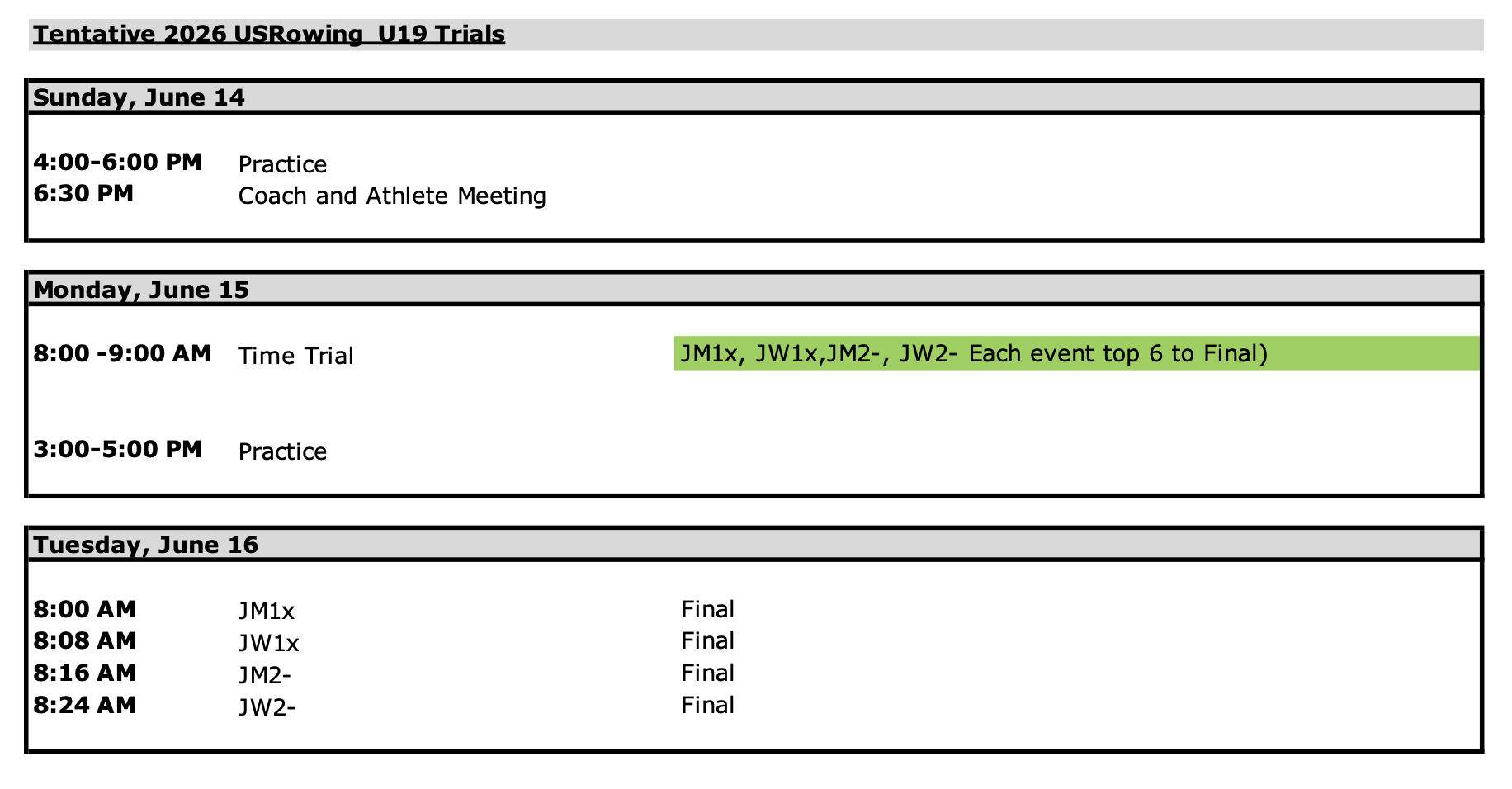 - All competitors must have completed the USRowing ECG and Pre-Competition Health Screening.